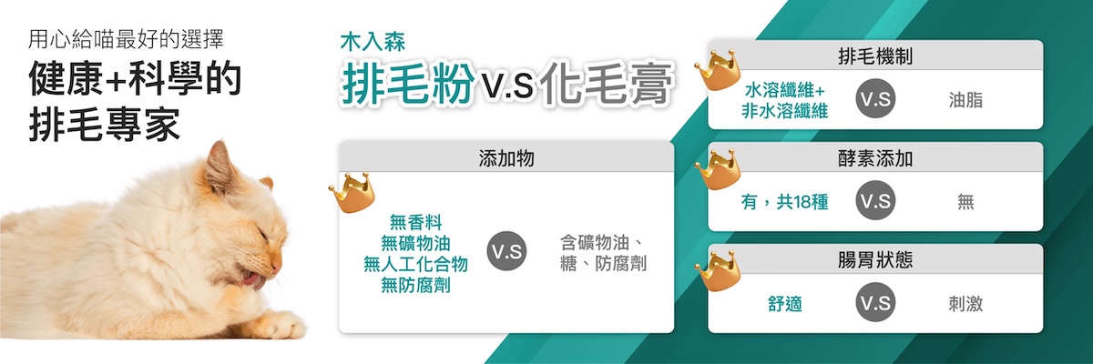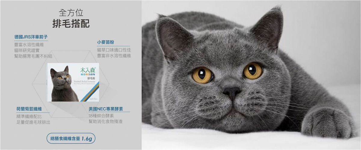 排毛粉銷售第一的木入森,是全市場領先推出三種口味、適口性最佳的排毛粉,以貓咪的腸胃舒適與健康為優先考量,使用德國JRS洋車前子作為先鋒,除了有豐富的水溶性纖維,還有非水溶性纖維,幫助貓咪腸胃毛團不糾結,再搭配荷蘭菊苣纖維、小麥苗粉與美國NEC的18種專業酵素,精研出最適合貓咪效果最優的排毛粉。