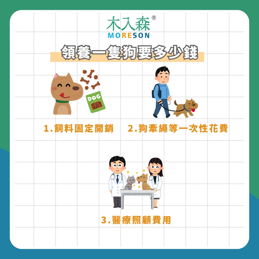 包含「狗籠、床、狗盆、牽繩、玩具」等,約 2,000 至 5,000 元,洗澡清潔用品,例如:洗毛精、梳子和潔耳液約 800 至 2,500 元。