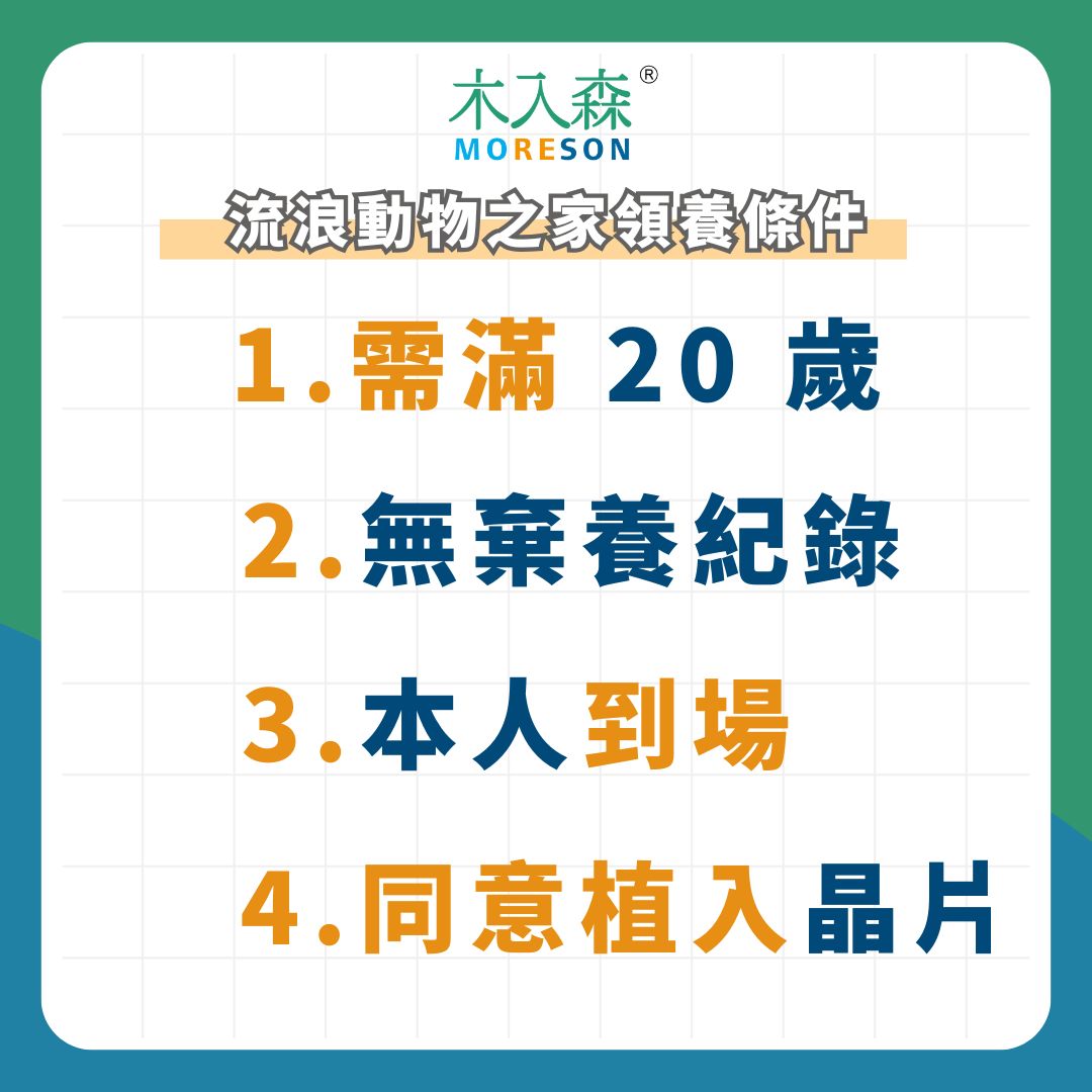 在領樣前,建議先了解流浪動物的「領養條件」以及「領養貓 / 領養狗的費用」,主要的領養資格包含:年滿 20 歲、無棄養紀錄、同意完成晶片植入等。