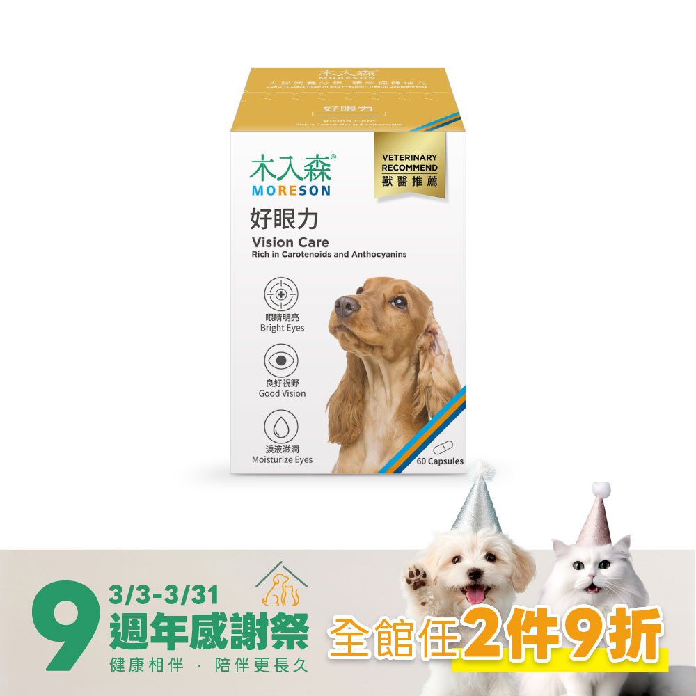 木入森犬寶好眼力,全方位眼睛保健葉黃素等 7 大配方,保護眼球與視力,補充眼睛流失營養,多元護眼明亮。