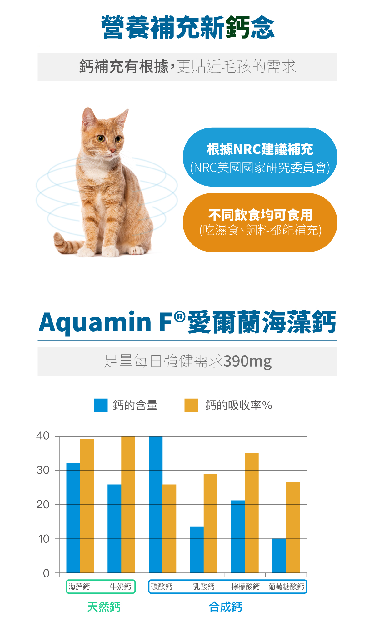 D藻鈣中的鈣來源天然,吸收性好且不易沉積,但仍建議依據本產品提供的不同飲食建議鈣補充量來幫毛孩補充。