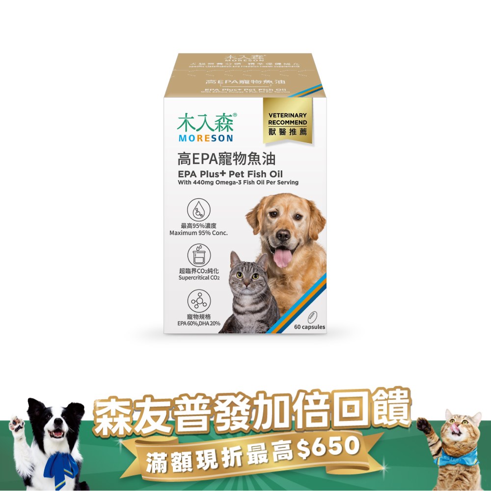 木入森高 EPA 寵物魚油,自主逐批檢驗Omega-3含量,確保Omega-3純度,最高可達95%,一粒就能補充足量的 Omega-3、EPA及DHA。每粒膠囊含有總共 400mg 的 EPA 及 DHA,濃度越高,每次補充的有效成分就越多,營養吸收更集中,效果更好!