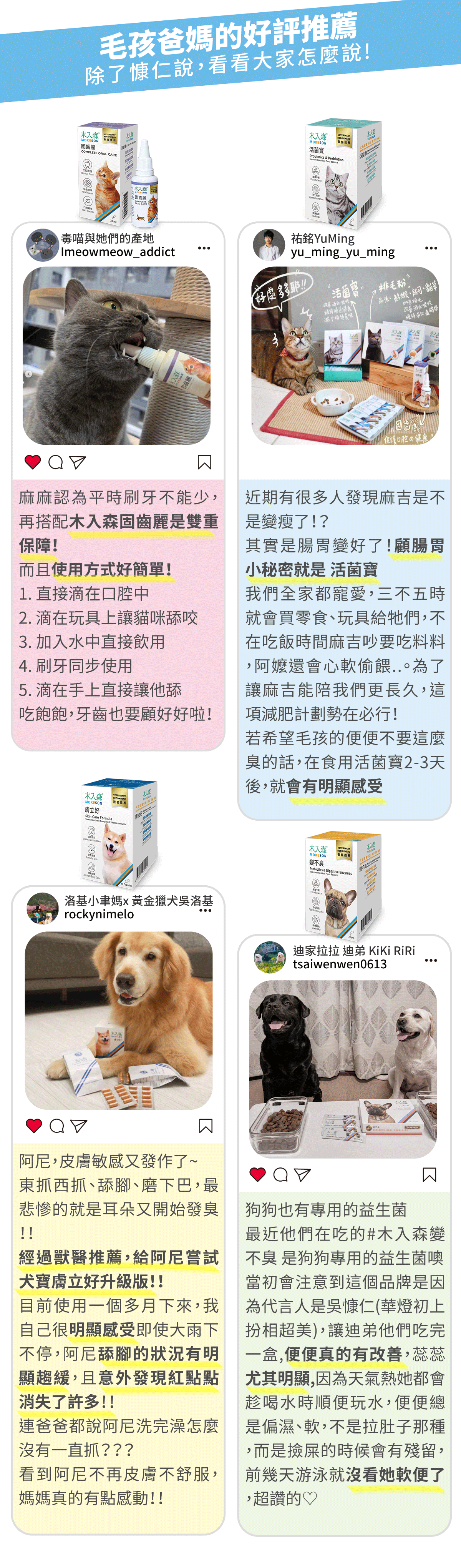 木入森 寵物魚油粉 30包|犬貓魚油 30包x1盒入 NT$820 方案金額 NT$ NT$ 820 請選擇方案 30包x1盒入 平均單價 NT$820 NT$ 820 請選擇數量 minus plus 加入購物車 立即結帳 close 木入森 狗狗腸胃益生菌 30包|犬寶變不臭 30包x1盒入 NT$550 方案金額 NT$ NT$ 550 請選擇方案 30包x1盒入 平均單價 NT$550 NT$ 550 請選擇數量 minus plus 加入購物車 立即結帳 close 木入森 貓咪排毛粉《任選風味》30包|貓換毛季必備 貓草風味1盒(30包/盒) NT$550 NT$550 方案金額 NT$ 550 NT$ 550 請選擇方案 貓草風味1盒(30包/盒) 平均單價 NT$550 貓草風味1盒(30包/盒)更優惠 NT$ 550 鮮蝦風味1盒(30包/盒) 平均單價 NT$550 鮮蝦風味1盒(30包/盒)更優惠 NT$ 550 起司風味1盒(30包/盒) 平均單價 NT$550 起司風味1盒(30包/盒)更優惠 NT$ 550 請選擇數量 minus plus 加入購物車 立即結帳 close 木入森 貓咪活菌寶 30包|貓咪益生菌 30包x1盒入 NT$550 方案金額 NT$ NT$ 550 請選擇方案 30包x1盒入 平均單價 NT$550 NT$ 550 請選擇數量 minus plus 加入購物車 立即結帳 close 木入森 犬寶膚立好 60顆|狗狗皮膚保健食品 60顆x1盒入 NT$920 方案金額 NT$ NT$ 920 請選擇方案 60顆x1盒入 平均單價 NT$920 NT$ 920 請選擇數量 minus plus 加入購物車 立即結帳 close 木入森 貓咪固齒麗口滴劑 30ml|貓咪潔牙滴劑 NT$330 方案金額 NT$ NT$ 330 請選擇數量 minus plus 加入購物車 立即結帳 close 木入森 犬寶膚立好 60顆x3|狗狗皮膚保健食品 NT$2,760 NT$2,705 方案金額 NT$ 2760 NT$ 2705 請選擇數量 minus plus 加入購物車 立即結帳 close 顯示第 1 - 7 筆 / 共 7 筆 1